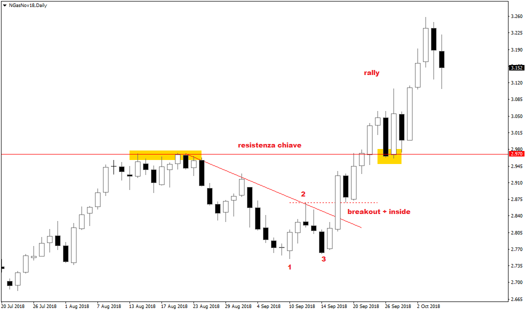 Il pattern assomiglia molto a un doppio minimo molto stretto: il secondo bottom è un po’ più alto rispetto al primo (non è contemplato il falso breakout). Il case study esaminato oggi è riferito al CFD sul future del gas naturale, time frame giornaliero, interessato da un trend di fondo rialzista. A un certo punto, però, avviene un pullback dei prezzi che tornano in area 2,74 $ dai top di periodo di 2,97 $. La discesa non spaventa i compratori, che anzi mettono in atto una strategia aggressiva per favorire la ripartenza della materia prima.
