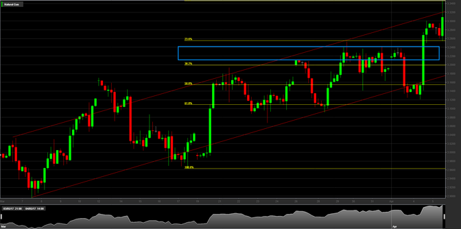 Il Gas naturale sul grafico a 4 ore mostra un andamento chiaramente crescente che parte dal minimo di 2,89$ del 7/03/2017, fino a raggiungere il massimo di 2,35$ odierno. Tale movimento è supportato dal canale rialzista evidenziato in rosso sul grafico sottostante. Vediamo che i prezzi stanno attualmente testando la parte alta del canale.