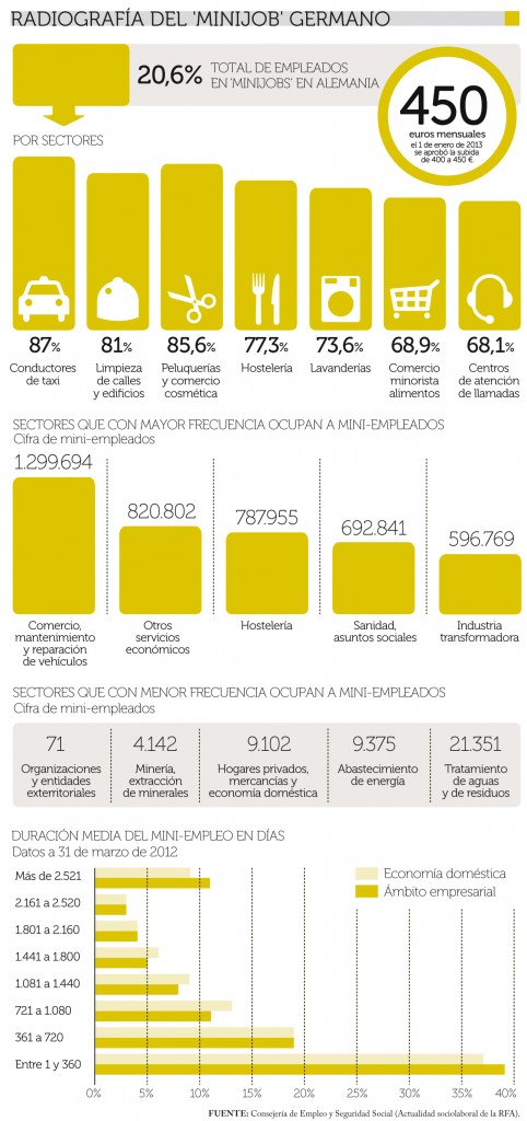 Tra gli occupati, il numero di lavoratori assunto con “contratto minijob" è di 7,3 milioni di persone, più di due volte e mezzo del numero dei disoccupati, il che vuol dire che essi rappresentano il 20% dei lavoratori tedeschi. Una cifra non da poco se si pensa che lo stesso 20% può essere considerato, in definitiva, sottoretribuito.