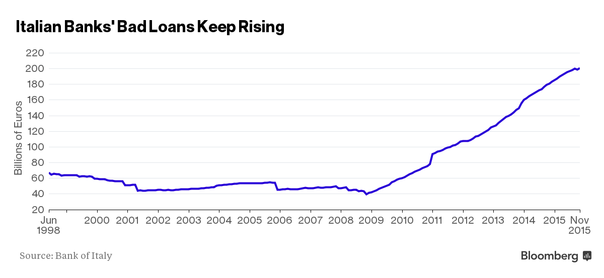 I dati pubblicati a fine 2015 hanno mostrato che i non-performing loans in Italia hanno raggiunto un totale di 300 miliardi di euro, il 17,3% dei quali sono prestiti non rimborsati.