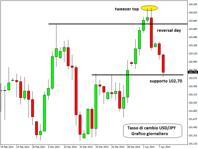 Sul forex lo yen si è apprezzato nel corso della sessione asiatica, complice la debolezza di Wall Street e Tokyo nelle ultime due sedute che ha creato i presupposti per una minore propensione al rischio. Il clima di risk off, amplificato dalle tensioni in Ucraina dopo la richiesta di secessione dei territori filo-russi nell’est del paese, sta favorendo molto lo yen anche sui mercati europei. Il tasso di cambio dollaro/yen continua a scendere e stamattina ha toccato un bottom intraday a 102,61. Attualmente siamo su una zona di supporto che, se perforata con decisione, potrebbe innescare un violento sell-off fino a 102 prima e 101,70 poi. In calo anche il cross euro/yen, sceso a 141,15.