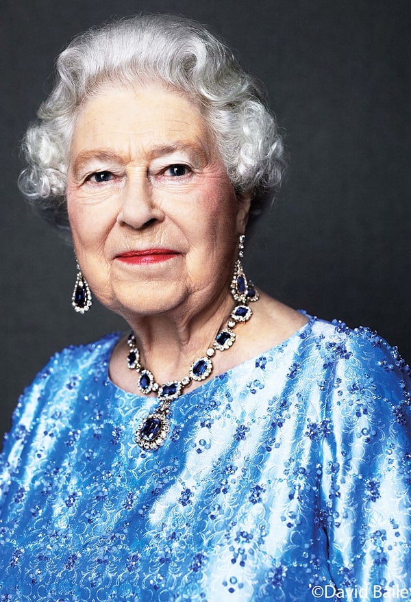 Per l’occasione è stata però ristampata una foto scattata nel 2014 dal fotografo inglese David Bailey che ritrae Elisabetta con indosso una collana di zaffiro, regalatole dal padre re Giorgio VI nel 1947 come dono di nozze.