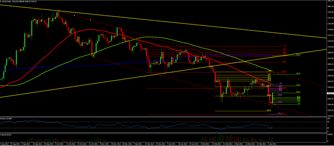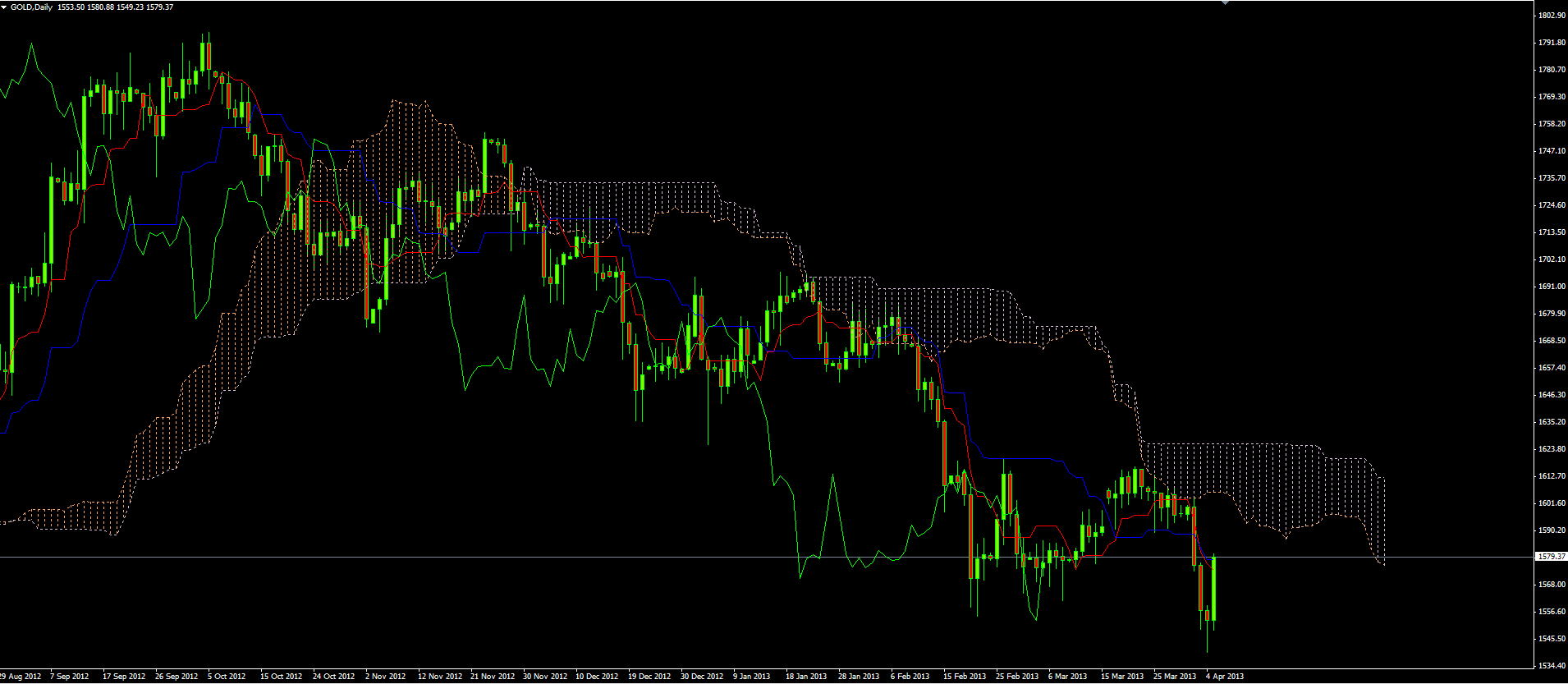 Breve aggiornamento della situazione a seguito del rally di cui è stato oggetto il Gold future nella seconda parte della sessione di venerdì 5 aprile: l’analisi tramite oscillatore Ichimoku non mostra alcuna variazione poichè la Tenkan Sen risulta ancora quotare al di sotto della Kijun, per cui nessun segnale di potenziale inversione, almeno per ora; tuttavia l’applicazione dei livelli di Fibonacci ci mostra una candela odierna che per dimensioni e volumi potrebbe essere considerata come un impulso long i cui sviluppi potrebbero essere quelli indicati nel grafico dai livelli Fibo in verde.