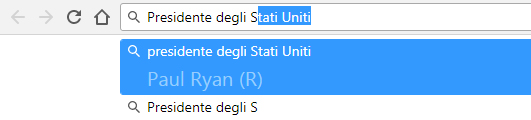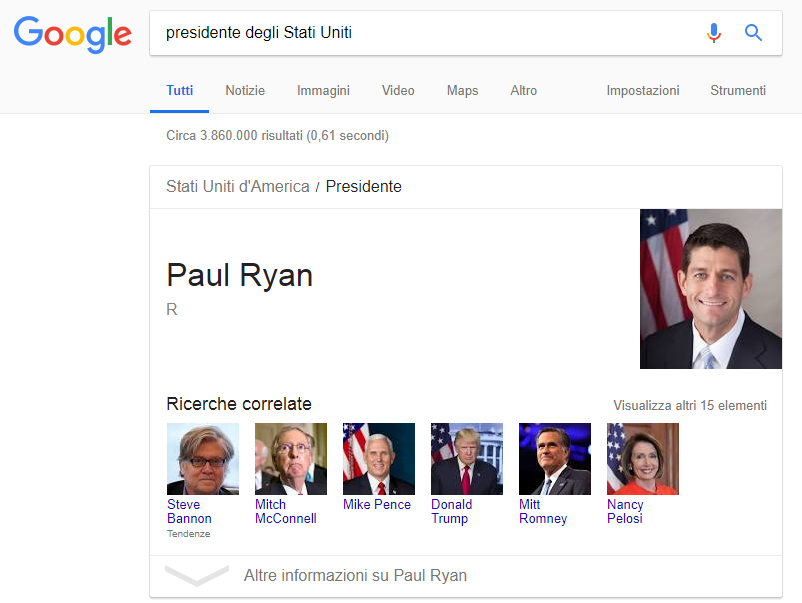 Pensando si trattasse di un errore provvisorio abbiamo deciso di continuare la ricerca; tuttavia una volta scritto “Presidente degli Stati Uniti” e premuto invio ci siamo resi conto della portata dell’errore, dal momento che nella posizione zero di Google compare sempre il nome di Paul Ryan come Presidente degli Stati Uniti (con tanto di immagine in primo piano).