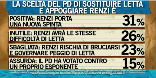 Pagnoncelli ieri sera ha presentato i risultati del sondaggio svolto tra gli italiani in seguito alla sfiducia di Letta e le consultazioni di Napolitano. Soltanto il 31% degli italiani italiani pensa che l’arrivo di Renzi a Palazzo Chigi sia un cambiamento positivo per il paese. Per la restante percentuale di intervistati la sostituzione di Letta con Renzi è inutile, sbagliata o assurda.