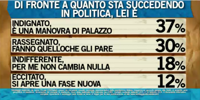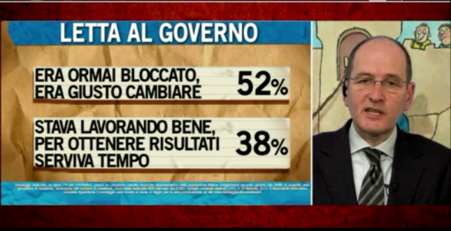 Secondo Pagnoncelli gli italiani auspicavano già dalla scorsa settimana una svolta nella gestione del Paese; uno su due chiedeva di tornare al voto il prima possibile. Gli italiani quindi sostengono il cambio di passo, ma non concordano con le modalità con cui si è arrivati al governo Renzi.