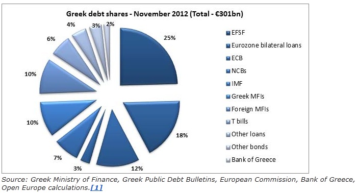 Il grafico mostra che il “settore pubblico” (EFSF, Eurozona, Fmi, Bce, la Banca di Grecia e altri ancora) detiene il 71% (212 miliardi) del debito greco. Le istituzioni finanziarie greche detengono circa il 10% (30 miliardi) e circa lo stesso altri istituti finanziari stranieri.