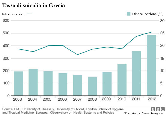 Il numero di suicidi in Grecia è cresciuto del 35% per gli uomini in età lavorativa. Il tasso di suicidi è infatti aumentato da 6.56 a 8.81 per 100.000 abitanti fra il 2011 e il 2012, secondo uno studio del British Medical Journal.