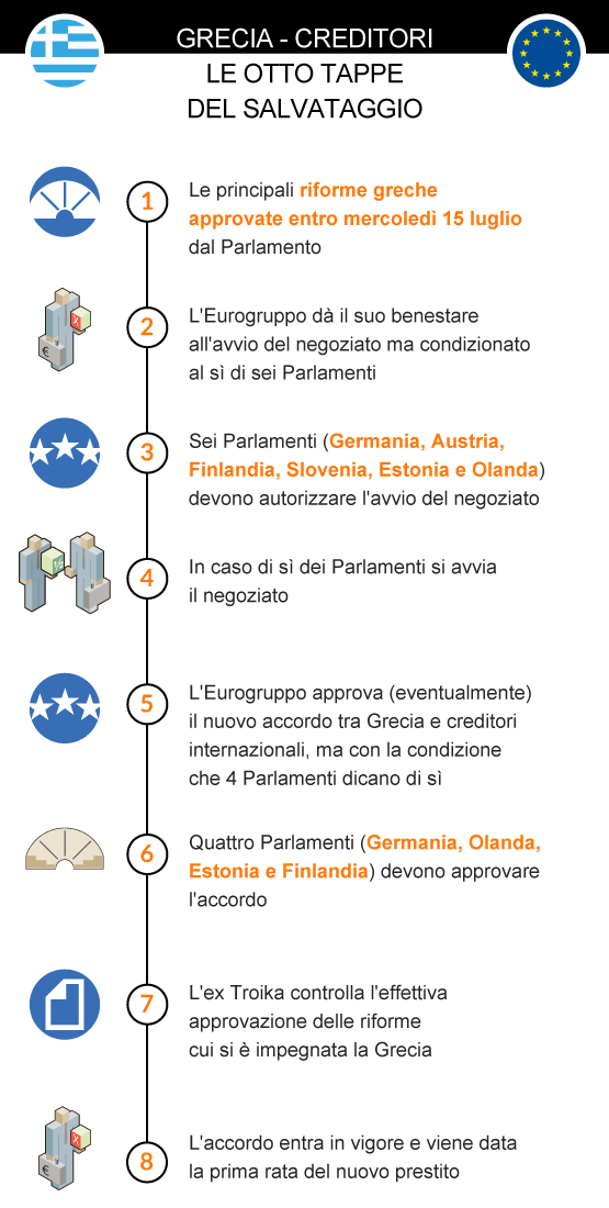 In accordo con l’Eurosummit, una volta accettate le prime riforme, si potrà partire con il piano di salvataggio dell’ESM, il quale, a sua volta, dovrà essere autorizzato dai parlamenti di Germania, Olanda, Austria, Finlandia, Slovenia e Lettonia.