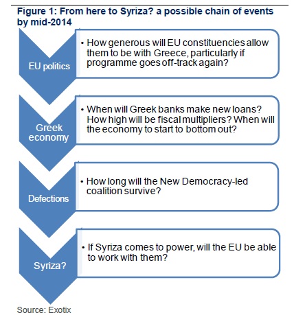 Alleghiamo una probabilità del 66,6% che la Grecia rimanga nell’euro nel corso dei prossimi due anni, e all’interno di ciò alleghiamo un’eguale possibilità che la Grecia si riprenda, continuando a sopravvivere. Da un lato, è difficile vedere la ripresa in un’economia in cui il settore pubblico si sta restringendo e il settore privato ha un accesso molto limitato al credito bancario. Dall’altra parte, ci deve essere una fine ad ogni recessione, anche per la Grecia. Molte persone qualificate sono senza lavoro ed è possibile che qualcuno troverà un modo per contribuire all’economia. Quindi, in ultima analisi, si tratta di una gara tra le forze negative in corso e una tendenza naturale alla chiusura di un grande output gap.