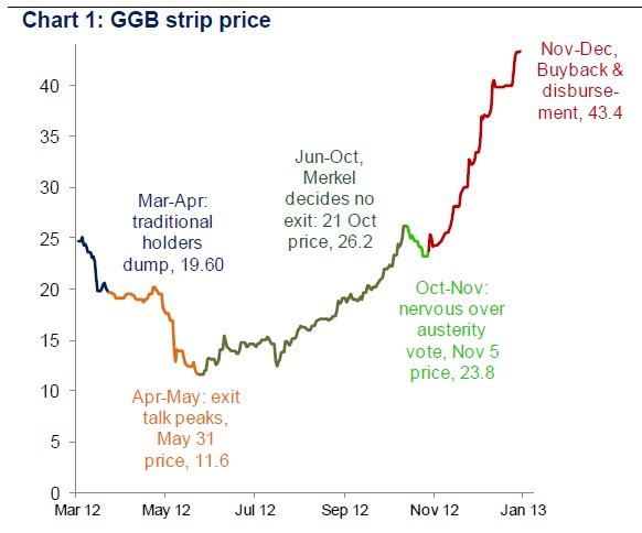 Ecco un grafico dello “strip price” (prezzo medio) dei titoli di Stato greci: