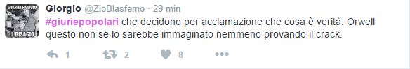 Così #Giuriapopolare si è trovato presto in cima ai trend topic di questi giorni, suscitando ire e risate da parte di quei bricconcelli degli utenti Twitter.