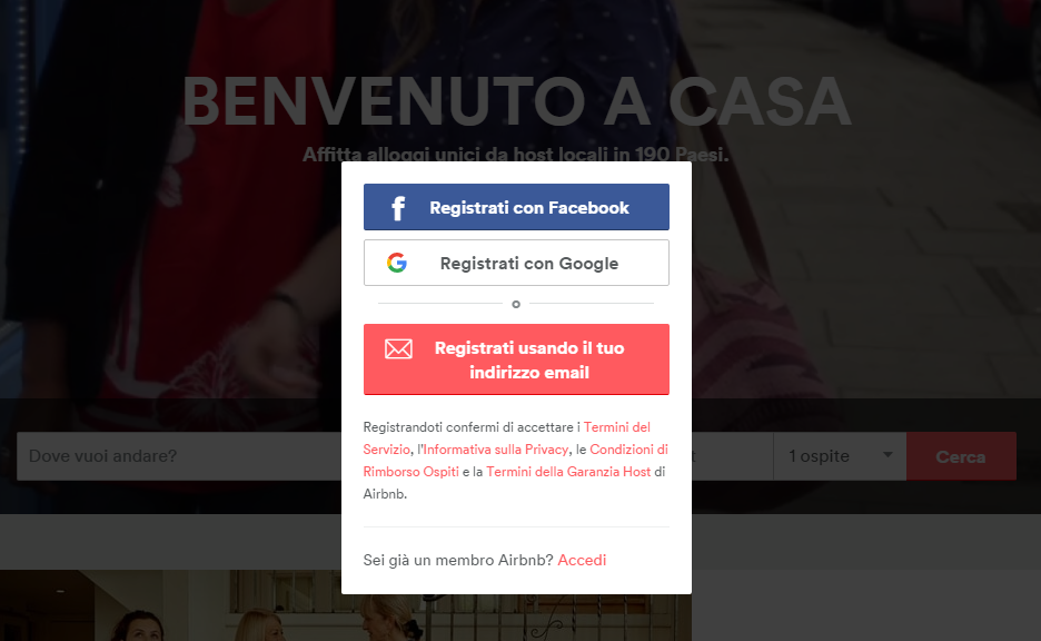 Nella pagina "Registrati" accessibile dalla home del sito di Airbnb in alto a destra ci troviamo di fronte alle seguenti modalità di iscrizione: