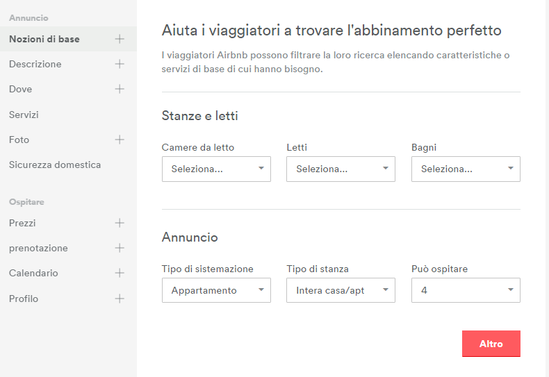 Subito dopo Airbnb ci farà accedere all’interno della pagina dove potremo inserire tutti i dettagli del nostro annuncio, compresi i contenuti descrittivi che raccontano la nostra casa e cosa i viaggiatori possono aspettarsi da un’esperienza di alloggio nel nostro appartamento.