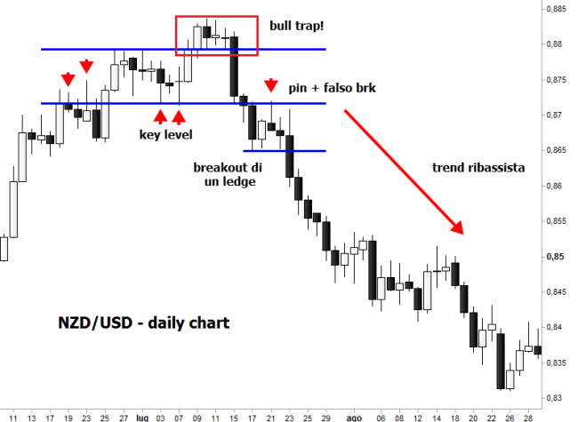 Oggi andiamo ad analizzare un case study che ci mostra come è possibile sfruttare i trend emergenti del mercato, a seguito della comparsa di segnali tecnici statisticamente affidabili. Il tema di oggi è quella che spesso viene chiamata come “trappola degli specialisti”, anche se nota tra i trader come bull trap (letteralmente “trappola per tori”, ovvero per i compratori). In pratica i buyers vengono ingannati sulla direzione del trend e a un certo punto scatta una brusca inversione, che fa crollare i prezzi nel giro di poco tempo. Il pattern può concretizzarsi su qualsiasi time frame, ma oggi andiamo a studiare un caso relativo al daily chart sul tasso di cambio NZD/USD.