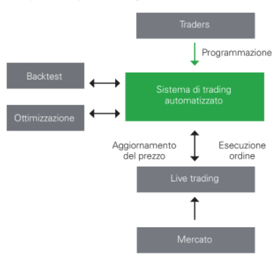 - Monitoraggio (non mostrato nel grafico): intendiamo il monitoraggio quale osservazione dello stato del sistema, della connessione internet, di messaggi di errore nel software / sistema operativo o la rilevazione di errori nell’hardware. Da tutte queste componenti potrebbero originare errori, i quali possono non avere nulla a che fare col sistema di trading.
