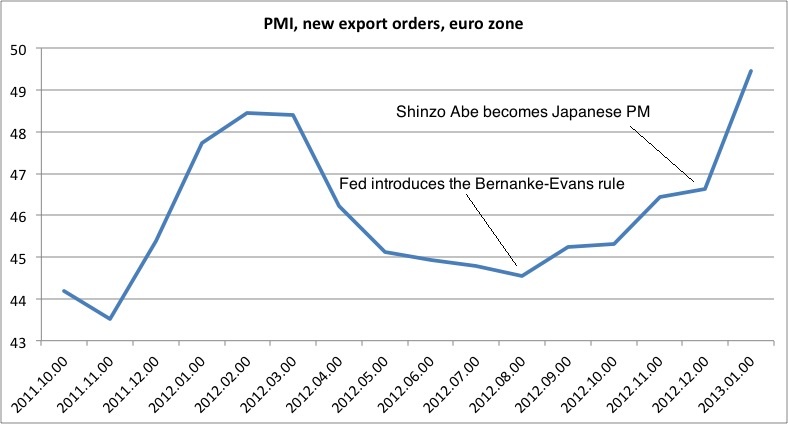 L’aumento delle importazioni in America e in Giappone è certamente una buona notizia anche per gli esportatori Europei, ed è probabilmente una questione molto più importante della perdita di "competitività" che potrebbe risultare dal rafforzamento dell’euro.