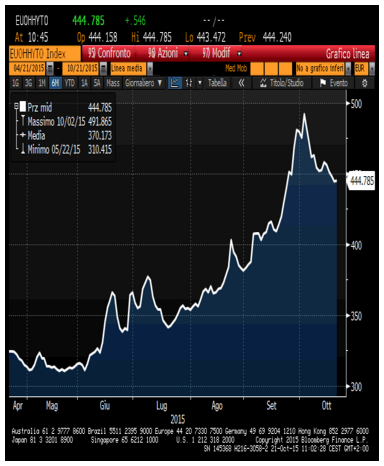 Euro High Yield: spread over swap EUR curve from April 2015 to October 2015.