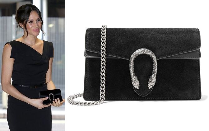 Kate e Meghan indossano molto spesso le borse di Gucci. Ad esempio, in questa foto la duchessa di Sussex indossa un impeccabile tubino di Black Halo impreziosito da una clutch di Gucci modello Dionysus in versione super mini. Sapientemente realizzata in vellutata pelle scamosciata nera, è rifinita con la caratteristica testa di tigre.