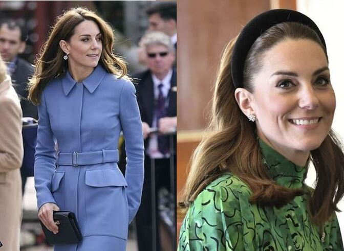 Asprey è un brand che rifornisce la famiglia reale dai tempi della regina Vittoria, non solo per le borse, ma anche per altri gioielli e accessori. In questa foto Kate indossa una Pochette Asprey Black Bullskin del 1781 abbinata a un cappotto blu cielo di Alexander McQueen, era il settembre 2019. Nell’altra immagine invece sfoggia un paio di orecchini di diamanti, indossati durante una visita reale in Irlanda sempre di Asprey.