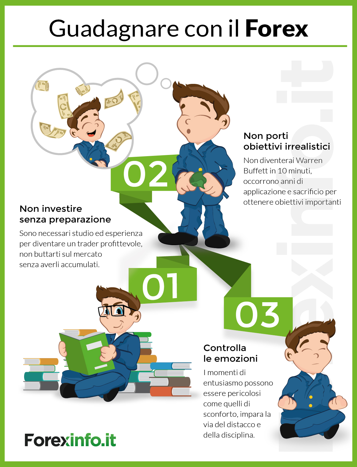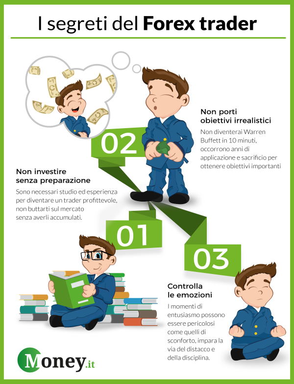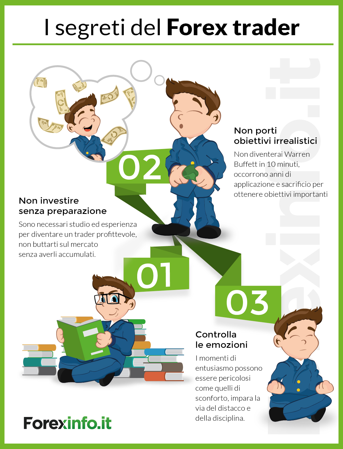 Ecco allora l’infografica di Forexinfo.it che illustra i 3 segreti del Forex trader. Leggi di seguito tutti i nostri consigli per seguire alla lettera i segreti del Forex e diventare un trader di successo sul mercato delle valute.