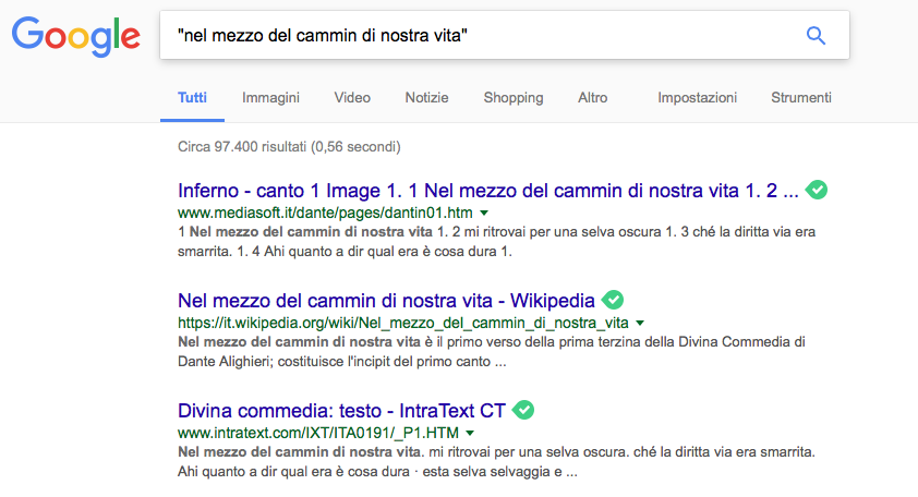 Un trucco per cercare in modo semplice le frasi su Google è quella di inserire le parole tra le virgolette dette doppi apici alti: “...".