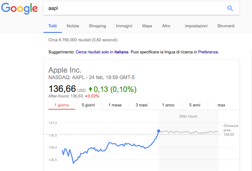 Infine per semplificare ancora di più le ricerche su Google e renderle ancora più rapide e specifiche possiamo ricorrere all’utilizzo delle sigle come nei casi in cui ci serve sapere l’andamento di un titolo azionario quotato in borsa o l’orario di partenza, di arrivo, il gate e il terminal di destinazione di un volo o per sapere se è in ritardo.