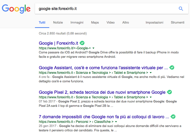 Un altro trucco per le ricerche su Google è quello di inserire il comando “site” se dobbiamo cercare un contenuto in un sito specifico. Ecco un’esempio tutti i risultati presenti sul sito Forexinfo che trattano la parola Google.