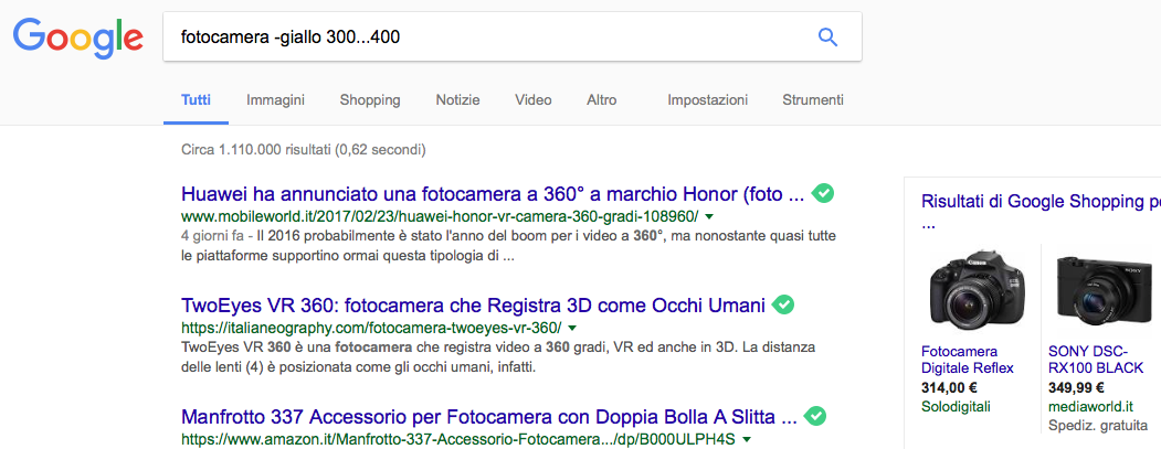 Per esempio inserendo il segno meno e i puntini come per “fotocamera -giallo 300...400 euro” avremmo come risultato tutte le fotocamere di colore non giallo con un prezzo minimo di 300 euro e uno massimo di 400.