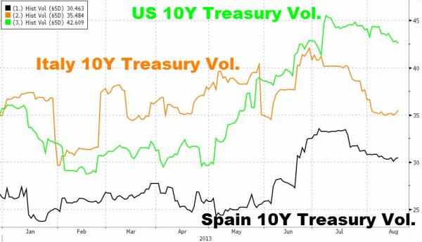 La figura qui sopra ci fa vedere come l’indice che misura la volatilità (ossia la rischiosità) a tre mesi dei titoli pubblici Usa sia più alto rispetto a Italia e Spagna. C’è da preoccuparsi? Forse non cosi tanto. La volatilità di un titolo infatti dipende, oltre che dalla durata e dalla cedola, anche dal livello di rendimento. Più basso è il rendimento di un titolo, maggiore sarà la sua volatilità. Il rendimento medio effettivo dei bond a 10 anni statunitensi è pari all’1.48%, mentre quello di Italia e Spagna è, rispettivamente, pari al 3.41% e al 3.16%.