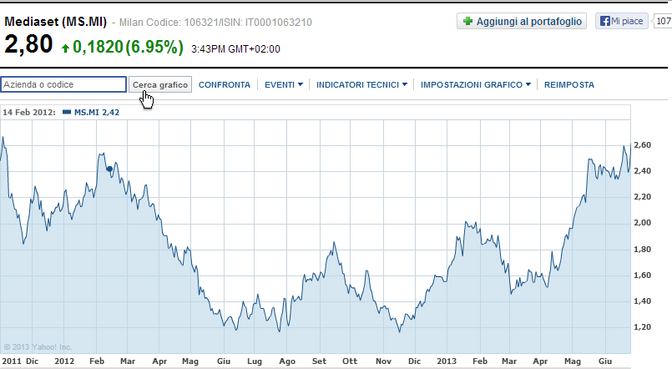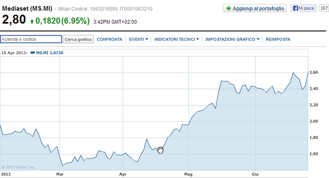 Anche la prestazione odierna conferma il trend degli ultimi tempi. Stamattina le azioni sono entrate in asta di volatilità e attualmente sono quotate a 2,80 euro con un rialzo del 6,95%. Maglia rosa e un guadagno quasi il doppio rispetto alla seconda in classifica Banco Popolare, che sale del 4,16% a 0,952 euro. Mediaset fa mercato a se quindi e la corsa non si arresta.