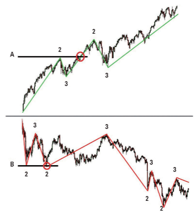Nella parte superiore della figura è possibile vedere un trend rialzista che comincia al punto A. Attraverso le correzioni e i movimenti si formano dei massimi e dei minimi crescenti, che vengono indicati rispettivamente con i numeri 2 e 3. Il grafico in basso illustra la situazione sopra descritta per un trend ribassista che si verifica nel punto B, e continua attraverso i minimi e massimi decrescenti indicati con i numeri 2 e 3.