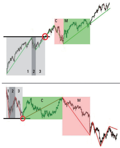 Il grafico mostra visivamente le fondamenta di un trend. Le zone grigie, indicate con 1, 2 e 3, rappresentano le prime fasi prima della formazione del trend. Solo dopo che si saranno formati due minimi e due massimi, il trend sarà comparso. Se sono più alti, il trend è rialzista. I minimi e massimi decrescenti formano invece un trend ribassista. Dal momento della formazione del trend, diventa chiaro quali saranno le direzioni di prezzo della correzione (C) o del movimento (M).