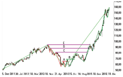 La figura 4 mostra un esempio pratico di un piano di trading. L’obiettivo è aprire una posizione long nella direzione del trend rialzista più alto, non appena diverrà evidente l’inversione della domanda. Il primo pre-requisito è stato soddisfatto nel momento in cui il trend di correzione (A) si è spezzato andando oltre il massimo precedente. Possiamo dunque aprire la posizione di trading non appena si sviluppa un trend positivo subordinato (B). Potrai trovare la risposta all’importante domanda “Chi compra dopo di te?” nei punti C, D ed E. Qui, sono più probabili gli ordini di acquisto per il vincolo della posizione dei trader di correzione (C, D, E), così come gli ordini di acquisto dei trend-trader (E).