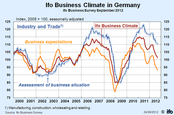 L’indice IFO sulla fiducia delle imprese in Germania ha registrato il quinto mese di declino attestandosi a 101.4, ben al di sotto di quanto atteso dagli analisti, ovvero 102.6 e in calo rispetto al 102.3 registrato durante il mese di agosto. Le aziende sulle quali è stata svolta l’indagine sono sempre meno soddisfatte dell’andamento dei propri affari e del contesto economico entro cui questi si inseriscono. L’indice IFO, infine, rileva forte pessimismo nei confronti del futuro economico. Continuano a prevalere le forze frenanti sull’economia della Germania.
