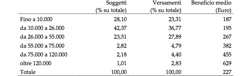 Prevede il totale annullamento della contribuzione IMU per le prime case esclusi gli immobili classificati nelle categorie catastali A/1, A/8 e A/9 analogamente a quanto valeva per la tassa ICI per l’abitazione principale nel 2008. Questa soluzione comporterebbe una perdita di gettito fiscale per le casse dello stato pari a 4 miliardi. Di seguito una tabella contenuta nel documento del Mef che indica i benefici derivanti dall’esenzione dall’ IMU sull’abitazione principale per classi di reddito complessivo dei proprietari: