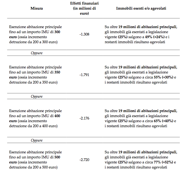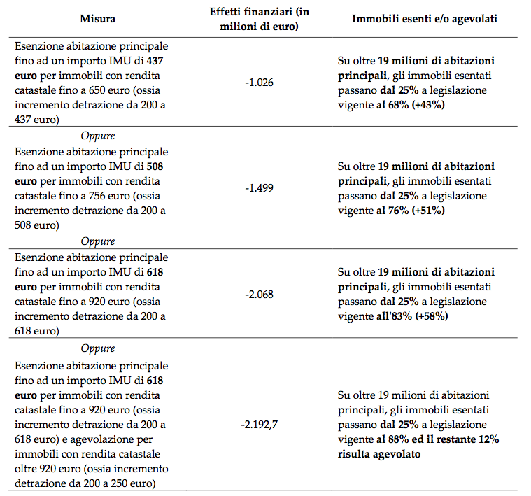 Il meccanismo di detrazioni attualmente in vigore rende esente dall’imposizione IMU sull’abitazione principale circa il 25% degli immobili, assicurando una forma di progressività del prelievo al crescere del valore catastale dell’immobile. L’incremento di tale esenzione aumenterebbe la platea dei contribuenti totalmente esenti dal pagamento dell’IMU. Di seguito una tabella con le quattro possibili attuazioni di tale proposta: