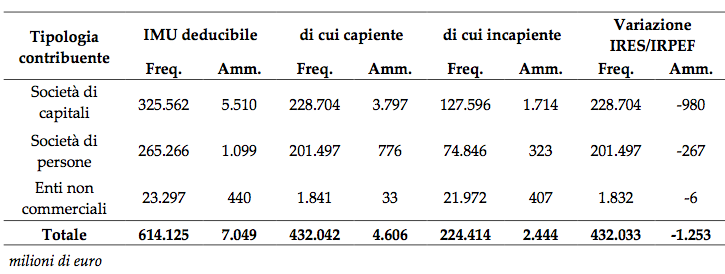 Tale proposta di deducibilità IMU per la imprese comporterebbe una perdita di gettito stimata in circa 1,25 miliardi di euro12 relativi a circa 432.000 contribuenti: