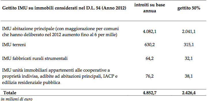 Nella seguente tabella si riporta, per ciascuna delle singole categorie di immobili interessate dal provvedimento, il gettito su base annua e quello relativo alla quota del 50%: