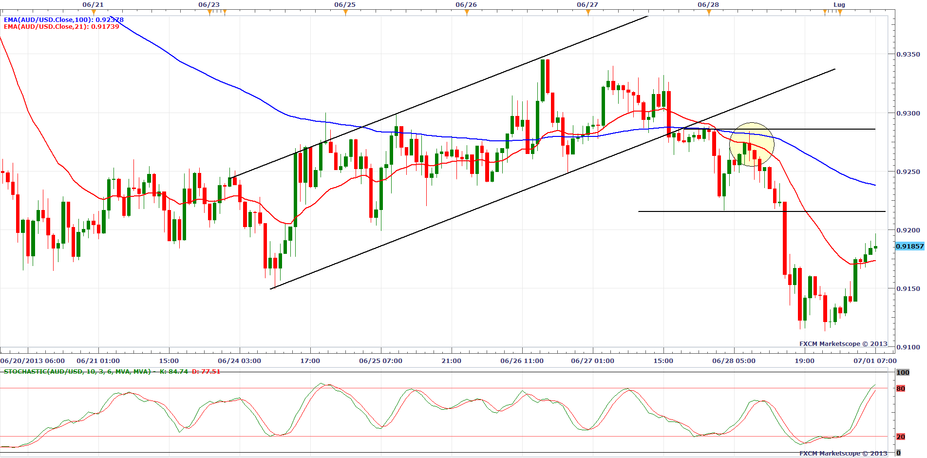 Durante il nostro morning meeting (in trasmissione ogni mattina alle ore 9.30) abbiamo cercato di chiarire il quadro tecnico confuso visto sul dollaro australiano, ipotizzando di poter pensare a vendite sotto la trendline ascendente che ha accompagnato la timida correzione dell’aussie. Il mercato è riuscito a compiere nuovi minimi senza tuttavia raggiungere il livello tondo di 0.9100, che risulta essere il punto principale da seguire per assistere a pesanti discese del dollaro australiano. Operativamente ora ci troviamo sopra la media a 21, il che ci fa dare importanza maggiore ai punti statici passanti per 0.9215. Essi possono essere utilizzati per pensare ad acquisti di dollaro americano, tenendo conto che il mercato potrebbe provare delle estensioni fino a 0.9235 prima di pensare di scendere nuovamente. Un superamento a rialzo di 0.9250 cambierebbe lo scenario, con 0.9285 livello di potenziale accelerazione definitiva sopra 0.9300.