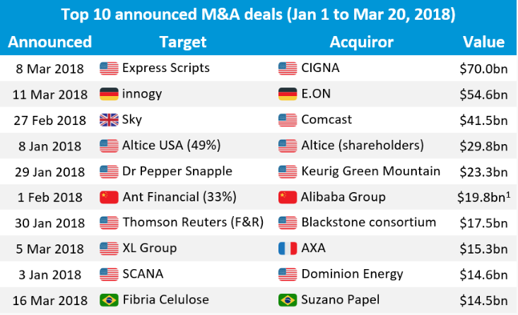 Nonostante ciò, i dealmaker sperano di ottenere ancora 10 miliardi di dollari di commissioni dagli accordi annunciati nei rimi tre mesi dell’anno e non ancora giunti in porto. La pipeline delle operazioni M&A programmate al 30 marzo 2018 era una delle più consistenti di sempre, fra i deal più interessanti in cantiere segnaliamo Viacom/CBS, Nissan/Renault e Wal-Mart Humana, operazioni che potrebbero continuare ad alimentare il pool di commissioni di consulenza per il secondo e terzo trimestre 2018.