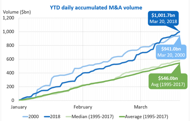 Nel primo quarter 2018 il volume globale di operazioni di fusione e/o acquisizioni (M&A, acronimo di Merger & Acquisition) è salito a 1,12 trilioni di dollari, registrando la crescita maggiore di sempre nei primi tre mesi dell’anno. Questa cifra ha consentito al settore M&A di superare i precedenti record del 2007 (1,08 trilioni di dollari) e 2000 (1,06 trilioni di dollari). Interessante notare che la size media a livello aggregato dei deal realizzati nel primo trimestre su scala globale ha raggiunto $ 274 milioni, il valore più alto mai registrato.