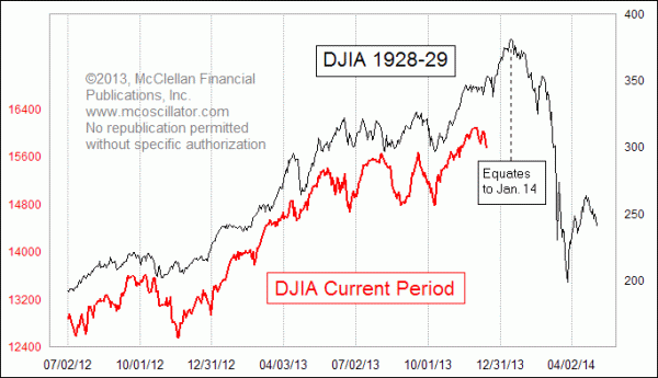 Ebbene, a quanto pare la storia tende a ripetersi e notando la sovrapposizione quasi perfetta tra i due periodi presi in esame, l’autore individua la data del prossimo gigantesco crollo di Wall Street: il 14 gennaio 2014 si ripeterà ciò che successe il 3 settembre 1929, quando il Dow Jones Industrial Average (DJIA) raggiunse il massimo storico a 381.17 punti prima di crollare nel giro di poche settimane. Ovviamente, aggiunge poi l’autore, non c’è alcuna garanzia che la data sia esattamente questa, più semplicemente spiega McClellan, l’analisi dei grafici rivela una somiglianza tale da permettere di individuare la metà di gennaio come data possibile, non certa.
