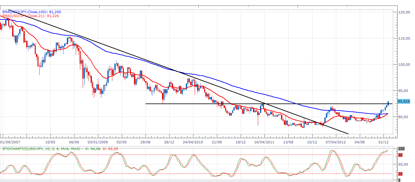 Il mercato sta scontando in maniera importante la possibilità che avvengano ulteriori svalutazioni della valuta nipponica, il tutto soprattutto grazie alle iniezioni di liquidità chieste a gran voce da Abe, ed un grafico settimanale mostra l’importanza del livello rotto questa notte. La divergenza ribassista individuabile su un grafico daily è risultata negata (anche se non del tutto) e la media mobile a 21 periodi (terzo livello di importanza sui 5 che analizziamo), unitamente ai punti statici passanti a 84.00 (primo livello) sono riusciti a dare un forte boost ai prezzi, che ora scambiano intorno a 86.00. Attenzione che lo Speculative Sentiment Index è andato a girarsi corto da long che era, questo significa che, in presenza di questo movimento direzionale, molti trader retail stanno cominciando a girarsi corti, con stop sopra i massimi, che se presi potrebbero portare ad ulteriori accelerazioni verso l’alto, da sfruttare su tutte le ricerche dei supporti, statici o dinamici che siamo, con stop posizionati in macchina sotto i livelli statici.