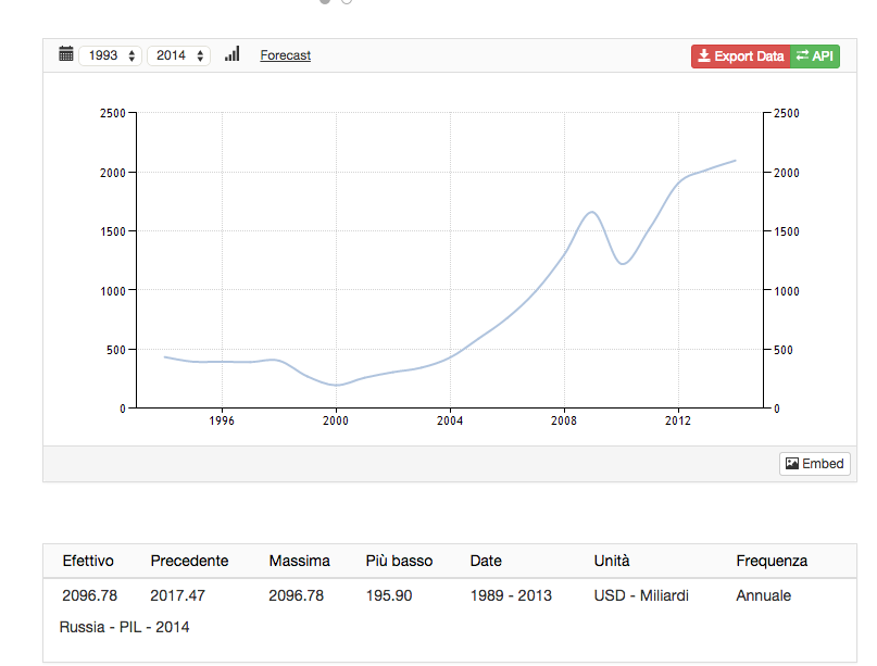 Il grafico dell’andamento del PIL in USD della Russia dal 1993 al 2014.