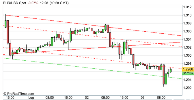 | Il grafico a 1 ora mette in evidenza il calo dell’Euro/Dollaro iniziato ieri |