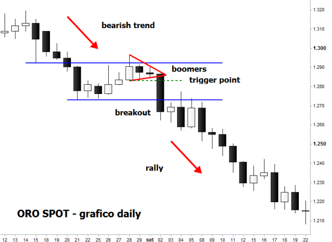 Ideato dal trader americano Jeff Cooper, questo pattern si presta meglio all’operatività di swing & momentum trading su base multiday. In ogni caso può offrire belle soddisfazioni anche agli scalper e ai day trader, in particolare quando appare sui grafici a 5 minuti o a 60 minuti. Il daily chart mostrato in alto si riferisce al mercato cash dell’oro, interessato da una fase discendente di breve periodo. A un certo punto si concretizza un pullback, che si ferma su uno swing level. Qui appare il boomers e il suo breakout fa esplodere i prezzi verso il basso.