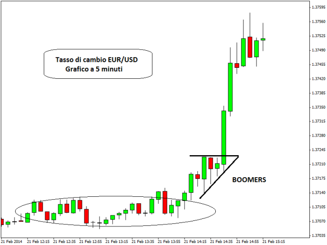 Il grafico in alto è riferito al tasso di cambio euro/dollaro, time frame a 5 minuti, interessato da un movimento rialzista intraday molto robusto che poi mostra una breve pausa. Si forma così un boomers, un pattern comunque piuttosto raro da trovare sia sui grafici multiday che intraday. Il breakout del boomers è un segnale di continuazione del trend decisamente affidabile e caratterizzato da un rapporto risk/reward davvero molto soddisfacente.