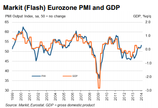 L’indice PMI pubblicato mensilmente da Markit per il blocco dell’euro composto da 18 nazioni è arrivato a toccare quota 53.2 a Gennaio, mostrando un incremento rispetto ai 52.1 registrati a Dicembre. Gli analisti di Reuters si attendevano un 52.4.