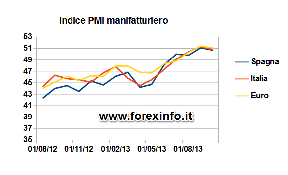 I dati di settembre sul PMI Finale Manifatturiero della zona Euro pubblicati il 1 Ottobre da Markit si erano attestati a 51.1, valore invariato rispetto alla stima flash. I risultati statistici mostrano che vi è una debole ripresa generale, con i livelli di produzione in aumento in tutti i paesi ad eccezione della Francia e della Grecia. Durante tutto il terzo trimestre del 2013 si è quindi registrata un’espansione, che secondo Markit pone così fine al lungo periodo di recessione.